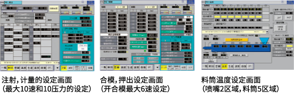 采用先进的控制逻辑,“Flex Servo"控制,同上控制注射速度和压力,对注射中激烈的压力变化进行安定对应。实现了不需要经验和直觉调整的高反应.高精度注射控制。